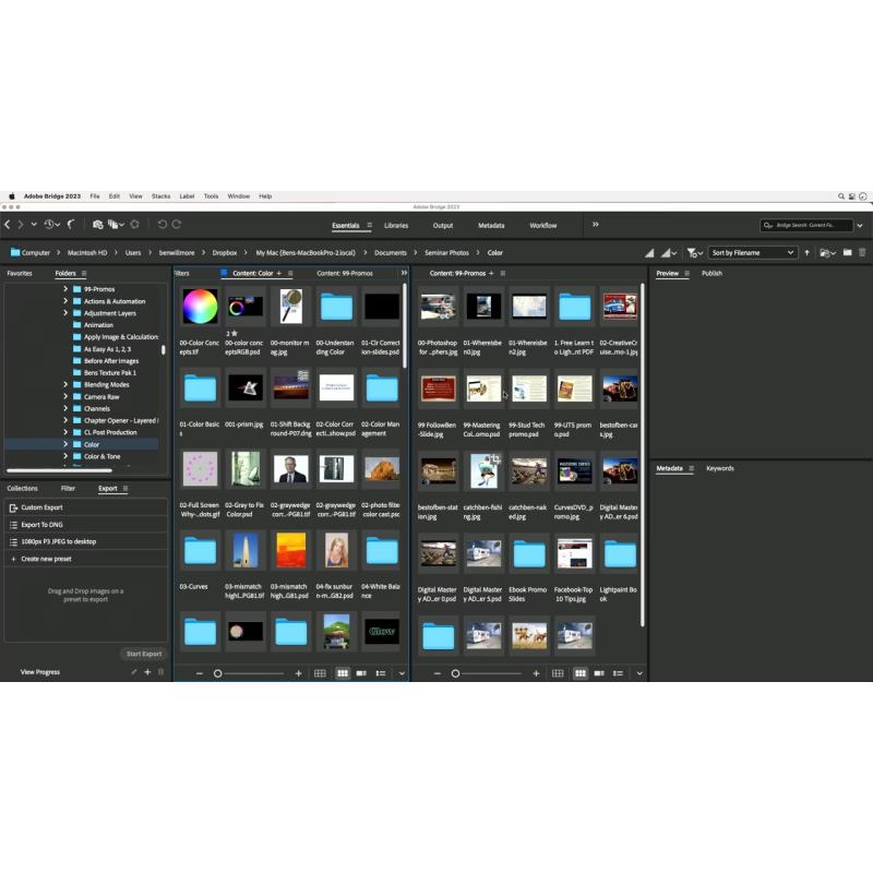 Adobe Bridge дозволяє створювати папки та каталоги для організації медіафайлів. Це допомагає зберігати файлову структуру впорядкованою та уникнути загублення файлів.2. Пошук та фільтрація файлів